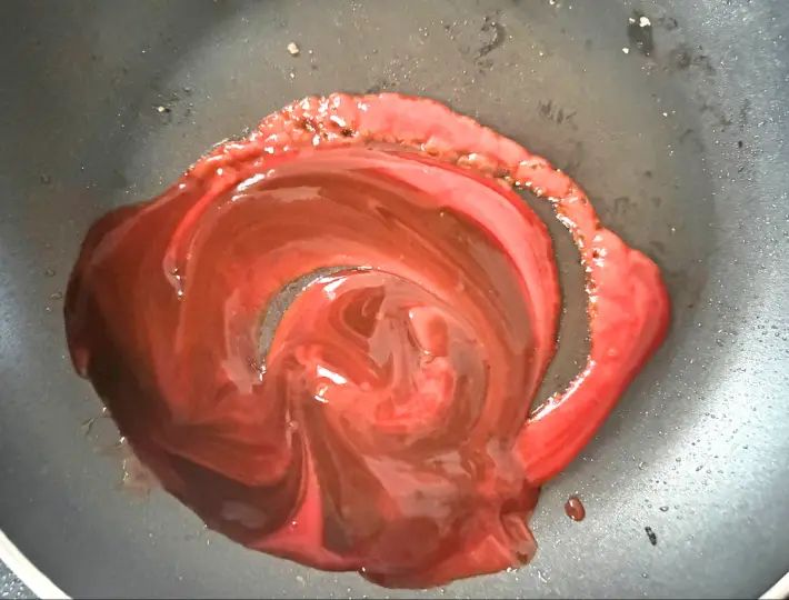 フライパンにケチャップと中濃ソースを入れ、混ぜながら火にかけましょう。