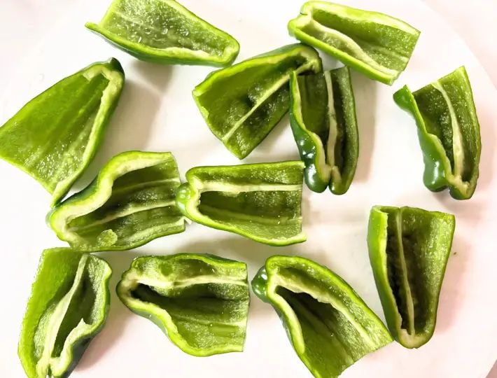 ピーマンは、ヘタを取って半分にカットし、種を取り除いておきます。