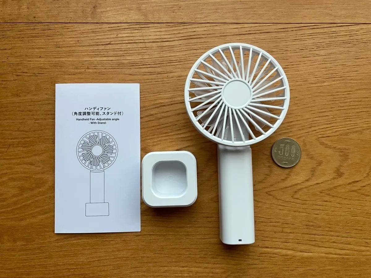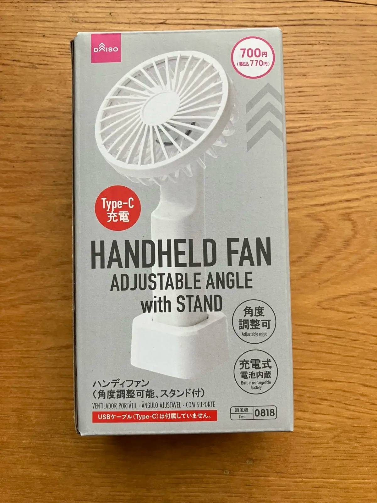 DAISO(ダイソー)の「ハンディファン(角度調整可能、スタンド付)」は、携帯に便利な小型の扇風機です。