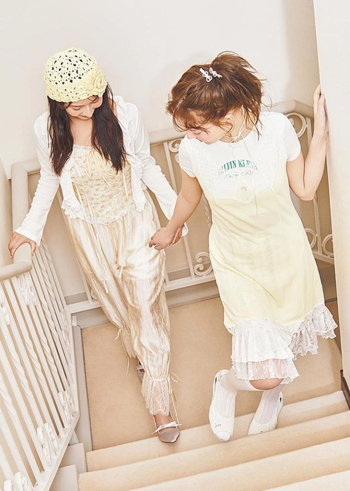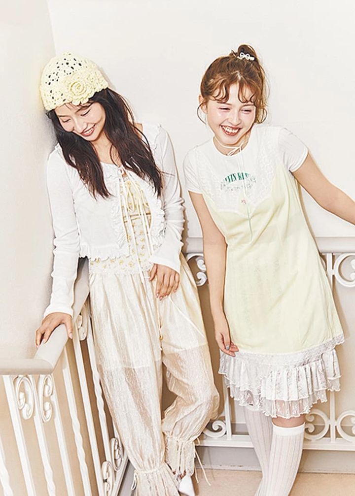 〈右・ナナ〉キャミソールワンピース 3,500円/Little Trip to Heaven Tシャツ 11,000円/Calvin Klein Underwear(カルバン・クライン)花柄サテンスカート 9,900円/merry jenny ヘアピン(2個セット)550円/パリスキッズ 原宿店 バレエスニーカー 10,780円/プーマ その他/スタイリスト私物〈左・紗英〉花柄キャミソール 5,390円/Little Trip to Heaven カーディガン 3,299円/WEGO レースパンツ 14,960円/LILY BROWN ニット帽 5,940円/カオリノモリ(OVERRIDE ルミネエスト新宿)パンプス 9,900円/チャールズ&キース(チャールズ&キース ジャパン)