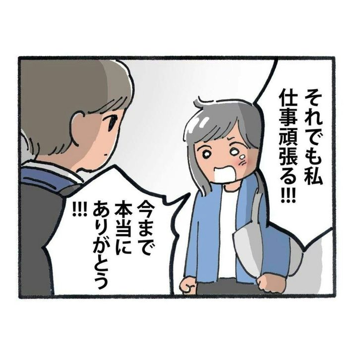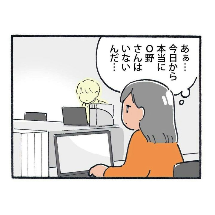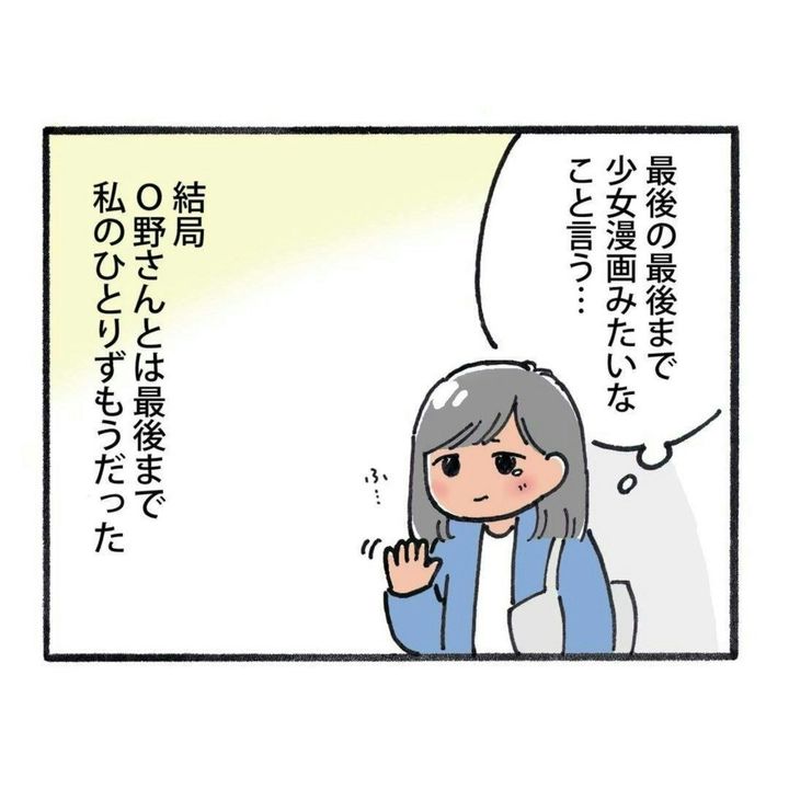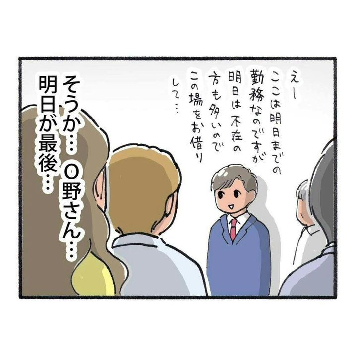 O野さんの最後の出勤日、M子さんはO野さんを追いかけて「聞いてほしいことがある」とうちあけます。それは、告白ではなく、「仕事をがんばる」という決意表明でした。