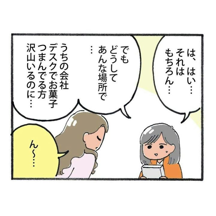 「職場でのイメージ」を守るため、「資料室でおかしを食べていた」と話すKさん。思わず「なんだそれ」と思ってしまったM子さん。