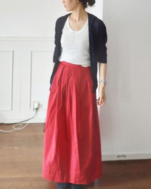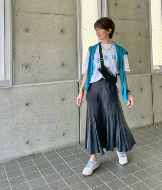 初夏に穿くロングスカートといえばコットンやリネンの生地をイメージしますが、50代が取り入れるときは素材選びを工夫するのがコツ。というのも夏向けのナチュラルな生地はほっこり感が強く、それが老け見えに繋がる場合も。モデルさんのように、しなやかな素材やハリ感のある生地を選ぶとおしゃれに決まりますよ。