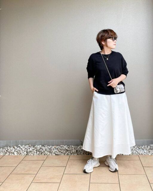 「普段はパンツばかり」、そんな50代には白ロングスカート×黒プルオーバーの組み合わせがおすすめ。全身をモノトーンカラーでまとめることで、スカートコーデが可愛らしくなりすぎず大人っぽい装いに。