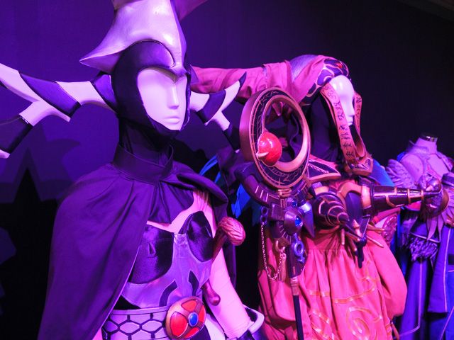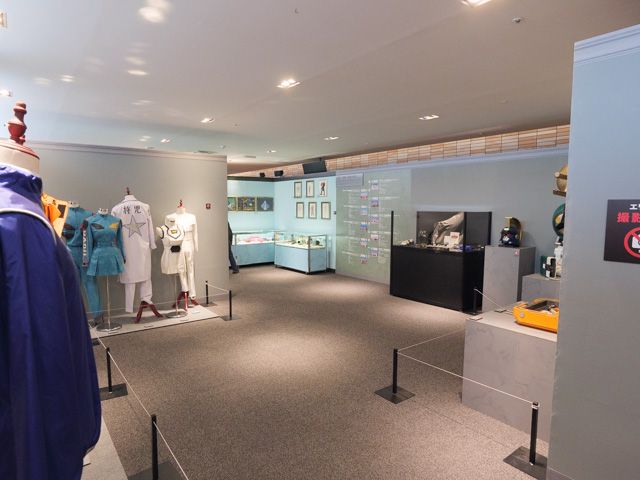 この部屋は、ダークサイドに焦点を当てたところです。主人公サイドを沢山苦しめた悪は作品になくてはならない存在ですよね。 まずは壁際一面に、女性幹部達の妖艶で緻密な衣装がずらり!!作り込みのすごさには驚きしかありません。縫いの細かさやパーツの繊細さまで是非ぜひじーーーーっくりと観察して下さいね。