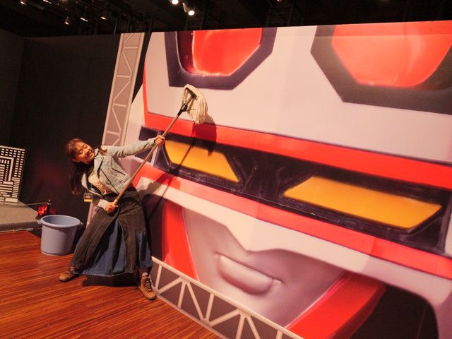次のメカニックコーナーに進むと!!!! おおお!!! 等身大のバイオロボの横にモップとバケツがおいてあって記念撮影ができる!?