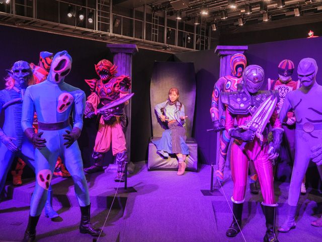 各作品の戦闘員に囲まれて悪の幹部ごっこで記念撮影できる椅子も置いてありました!た、、楽しい、、、!! この椅子の位置からだと、滅多に見ることができない衣装の後ろ姿をじっくり見れたことも面白かったのです。