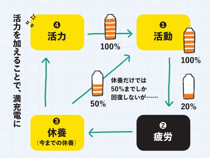 日中活動をして疲れがたまり、休養する。また翌日、活動をするときに、この休養がフル充電されていないことが疲れがたまる原因。そこで、「