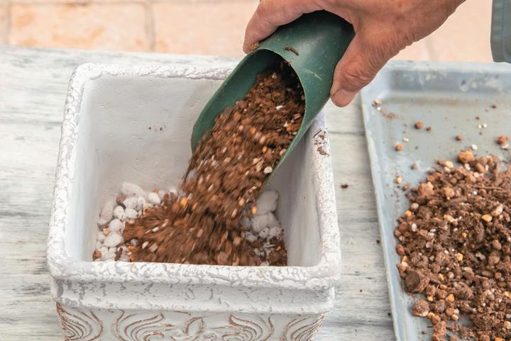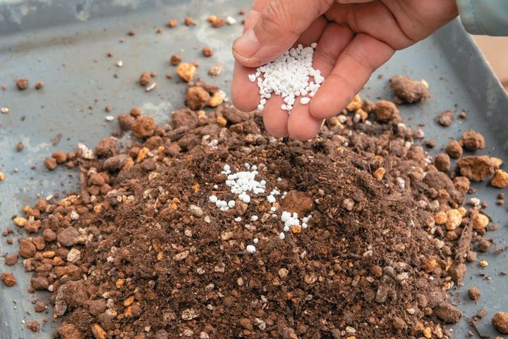 トレーの上などで、培養土に緩効性肥料を規定量入れ、混ぜておく。