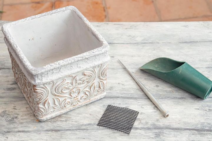 鉢(今回は16cm×16cm、高さ15cm)、鉢底ネット、土入れ、根かき棒。そのほかに鉢底石、培養土、緩効性肥料、ハサミなど。