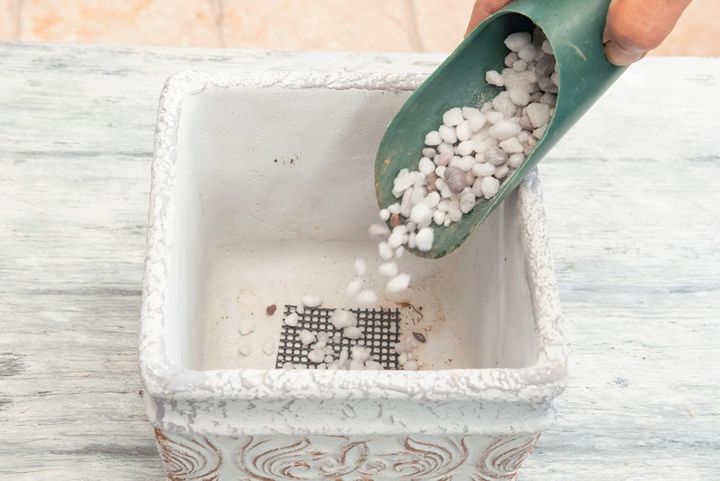 鉢底穴に鉢底ネットを敷き、その上に鉢底石を鉢の高さの1/4程度入れる。