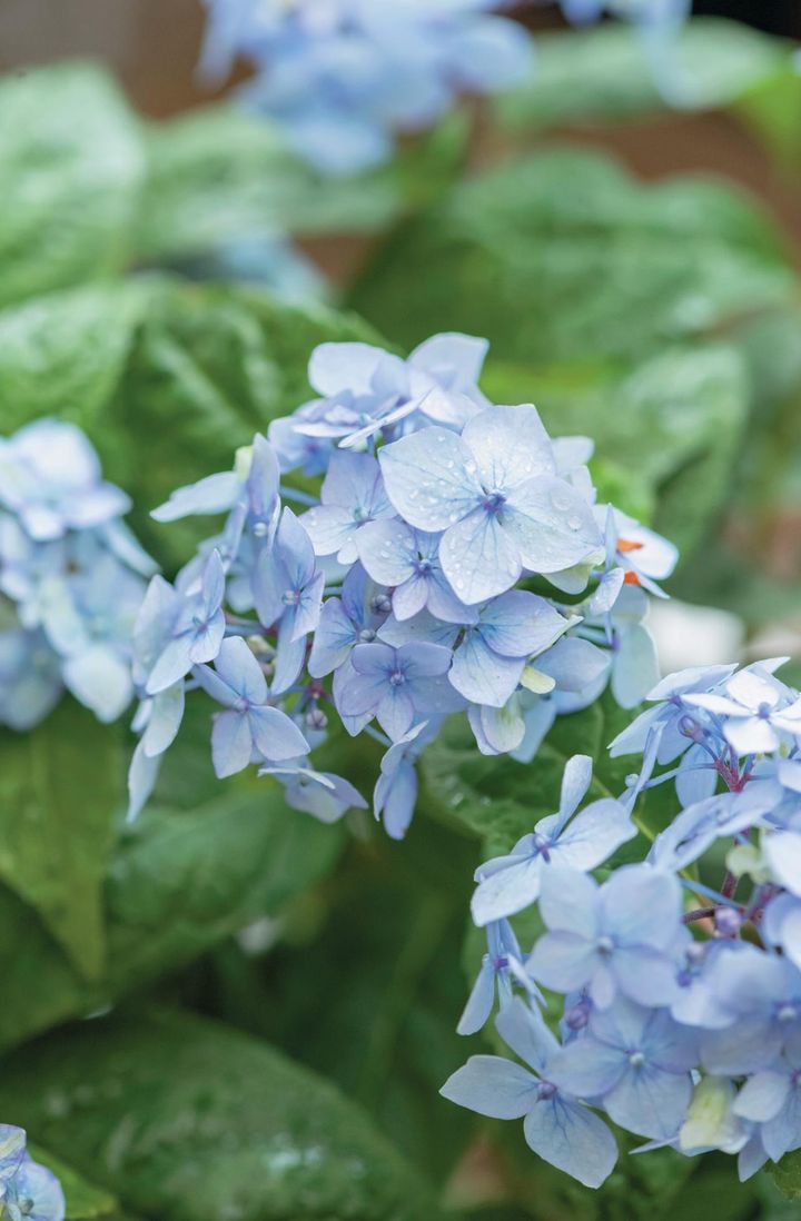 淡いブルーがさわやかな手まり咲きのヤマアジサイをメインに使いました。花つきがよいので、1ポットで十分な存在感があります。合わせたのは、ヤマアジサイとほぼ同じ花色のフェリシア。茎の先に花を咲かせて寄せ植えに変化をもたらします。グレコマの小さな葉もヤマアジサイの葉と対照的でよく映えます。