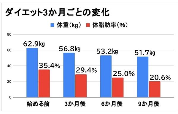 ちなみに9か月後には、体重がさらに1.5kg減り、体脂肪率も4.4ポイント減って20%台になりました。
