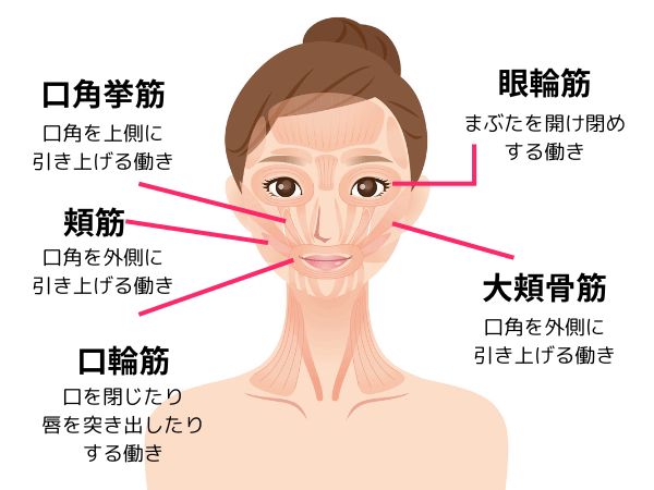 • 口輪筋(こうりんきん)…口角を外側に引き上げる働きをする筋肉