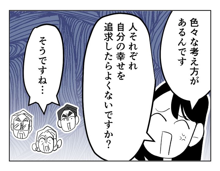 私(義母)は、夫と2人暮らし。結婚してからずっと専業主婦として家族に尽くしてきました。もちろんいいことばかりではありませんでしたが、家族の笑顔を見られることが私の最大の幸せでした。そのとき気が付いたのです。女性の幸せは、家庭の中にある……と。だからその気持ちをアリサさんにも伝えたかった。でも彼女の考え方は別にあったようでした。間違っているアリサさんの考えをどうにか修正しようとしたのですが……どうやら間違っていたのは、私の考え方のようです。