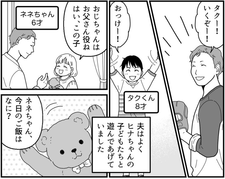 義母が他界してから、ヒナちゃんと私たち夫婦はお互いに支え合ってきました。夫はタクくんやネネちゃんのことをとても可愛がっていて、よく庭でキャッチボールをしたり、お人形遊びに付き合ってあげたりしていました。