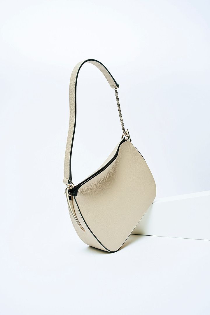 開口部が片側にしなる、アシンメトリーなショルダーバッグ。ストラップを支えるようにエンブレマティックなパンテールが配された、優美なデザインです。
