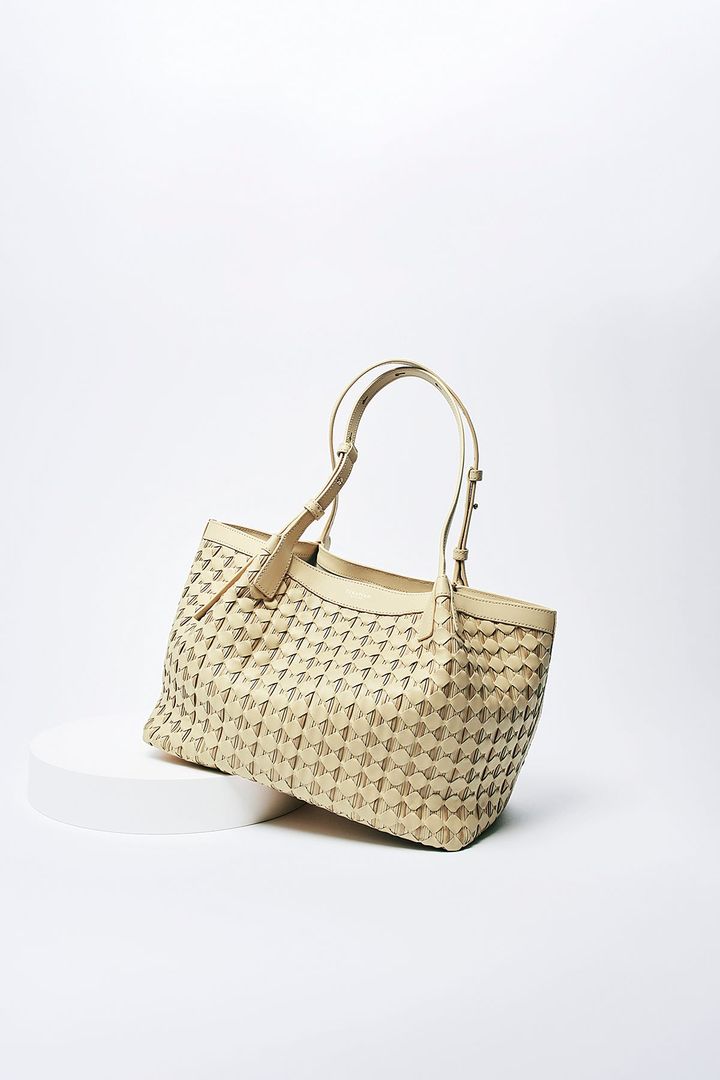 〈右〉柔らかなナッパレザーをイントレチャート技法で編み込んだ、卓越した職人技が宿るトートバッグ。両サイドのマチは、荷物の量やスタイルに合わせて手軽に変形できます。