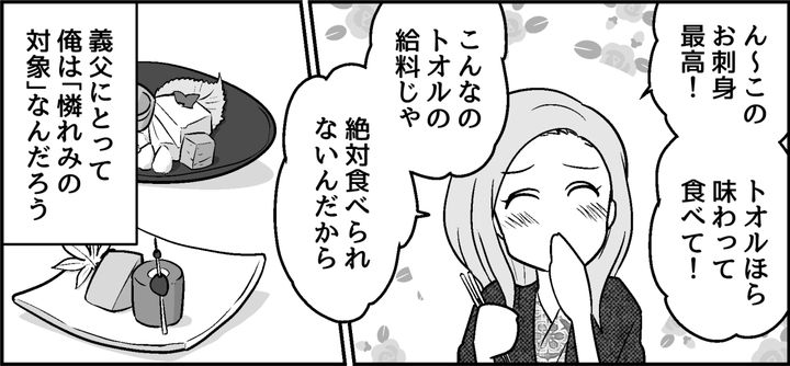 モモカは楽しそうに義両親と談笑している。義父にとって俺が「憐れみの対象」であることを、モモカは気づこうともしない。……いや、気づいていて、それが正しい力関係だと思っているのだろうか? 気が重く、食事がのどを通らない。