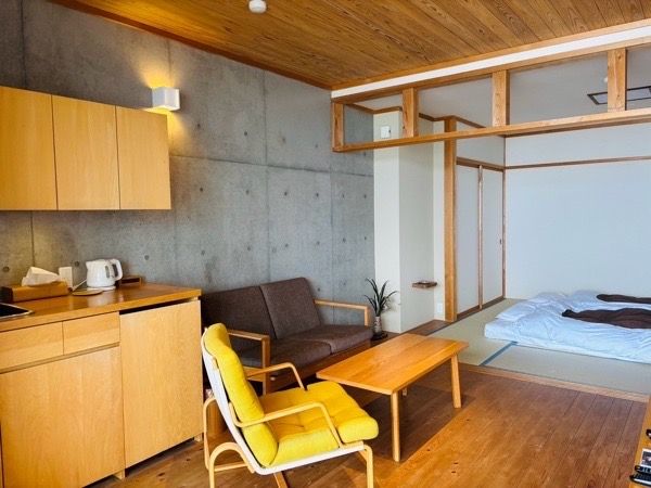 海辺リビングには、ゆったりソファ。さらにミニキッチン付きなのもありがたい。好きなお菓子とドリンクで自分へのご褒美です。