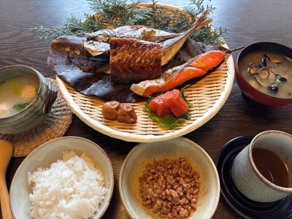 今回の旅は、朝食のみいただきました。ここまで美しい素朴な料理は初めてでした。焼き魚が3種類、たらこ、梅干し、しじみたっぷりの味噌汁、わら納豆、鶏肉のスープ。ご飯はおかわり自由です。