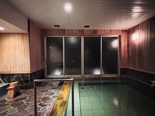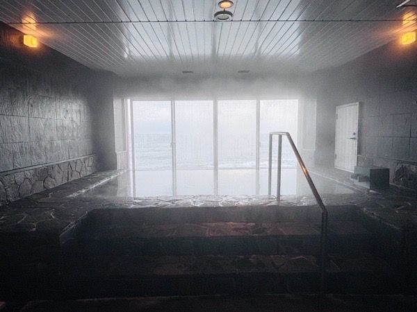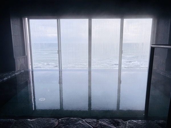 まず1つめは石風呂。モノカラーの空間が、海を際立たせています(※お風呂の写真は旅館側の了承をいただいて撮影しております。浴場への携帯持ち込みはご遠慮ください)。