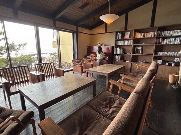 待合に通されると、海が広がる開放的なロビーに案内していただきました。木の温もりと、優しいランプ、アロマの香りに早くも癒されます。大きな窓で大海原を堪能できます。