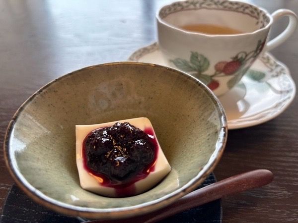 食後のデザートは豆腐を使用した甘味とハーブティ。食事も目の前の海を眺めながら、美味しくいただきました。常に海と癒しに囲まれた空間で非日常を味わうことができました。