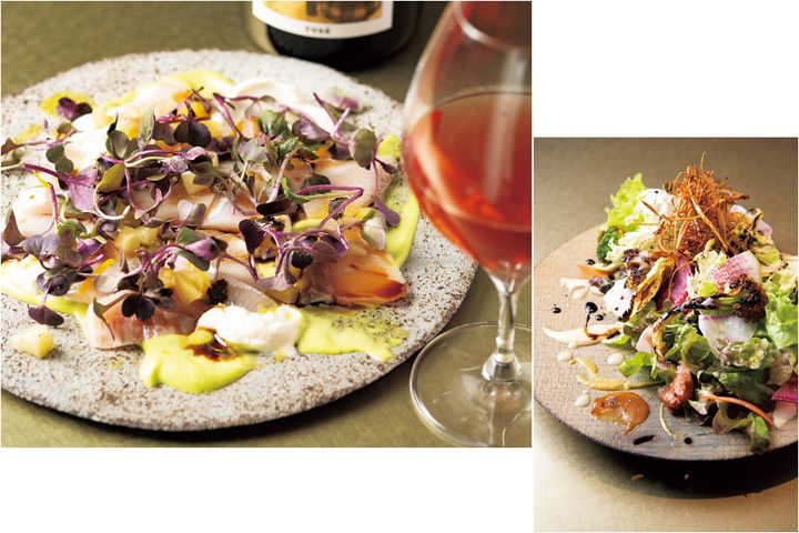 〈左〉魚介は全て津本式「究極の血抜き」を経て宮崎から直送されたもの。ヘベスブリに塩漬けの柚子皮やトマトのピクルスを散らし、青ねぎマヨネーズと豆腐ムースを添えて。鮮魚のカルパッチョ¥1,600、グラスワイン¥1,200~〈右〉長野の農園「アグロノーム」から届くものを中心に30種類以上の野菜を色とりどりのソースで。素材と産地への想いを込めて「産土」と名付けられたサラダ¥1,500