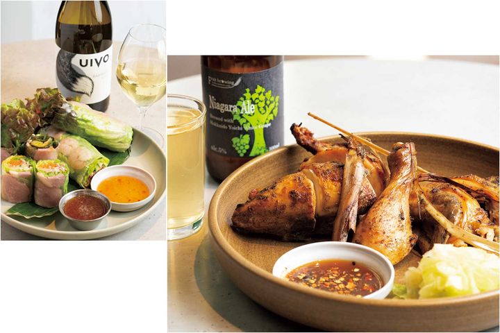 〈右〉レモングラスやパクチー、ガーリックなどで一晩マリネした鶏肉は、蒸してからオーブンで焼き上げることで身離れよくふっくら、表面はパリッ。フルーティーなタマリンドのソースを添えて。ガイヤーン 骨付き鶏のレモングラス焼き¥1,980、クラフトビール¥1,200~〈左〉エスニックの定番・生春巻きはその時季ならではの具材に変わるのが楽しい。この日は海老となます、鴨と蕎麦という2種類がラインナップ。1本¥800