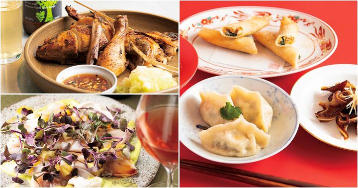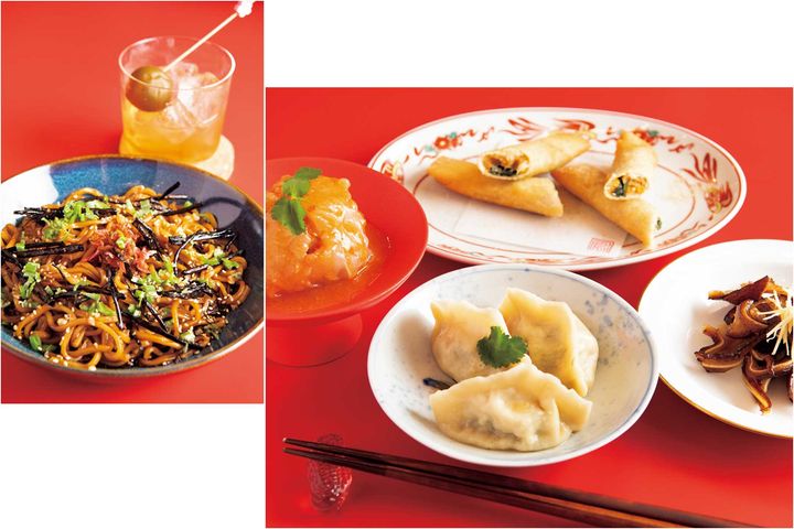 〈右〉むっちりとした皮に帆立と豚肉の餡を包んだ、自家製海鮮水餃子¥1,300。電釜で蒸したて熱々、タピオカ粉で作る皮やタケノコ入り肉餡の口当たりが楽しい、手作りバーワン¥780。季節によって内容が変わる自家製春巻き¥990、台湾おつまみ豚耳¥990〈左〉自家製葱油と桜海老の香りを纏った麺は〆にはもちろん、お酒が進むアテにも。台湾風・桜海老XO醤葱油まぜ麺¥1,300、風鳥梅酒2年熟成¥1,500