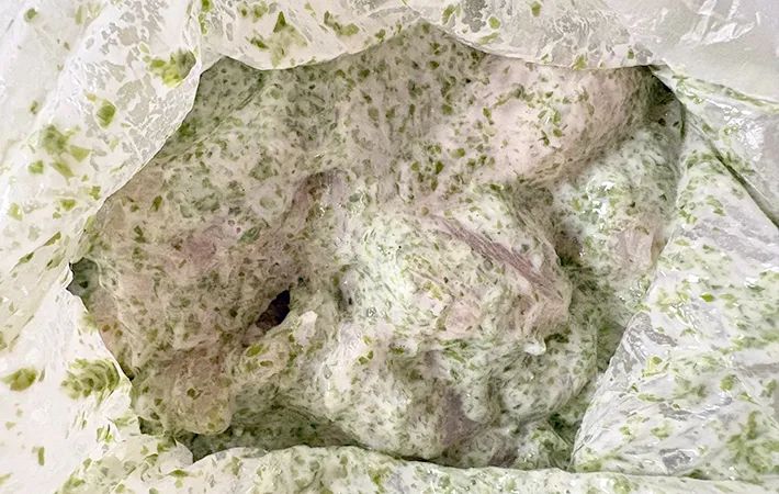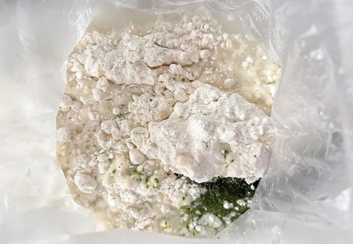 ポリ袋に青のり、鶏ガラスープの素、薄力粉、水を入れ、粉っぽさがなくなるまで揉みます。