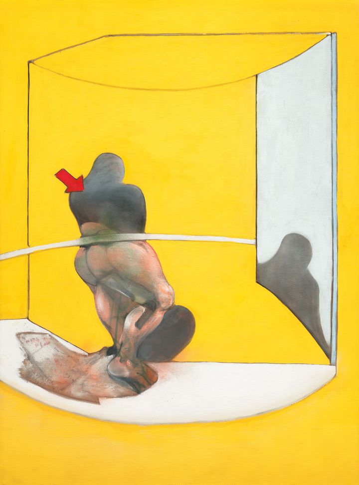 『Study from the Human Body 』(1986年)。上記の作品と同様の人物像と反射の関連がここでは鮮やかな黄色を背景に展開され、イメージの即時性と奇妙さが強調されている。ⒸThe Estate of Francis Bacon All rights reserved DACS London ARS New York 2026 photography: Annik Wetter