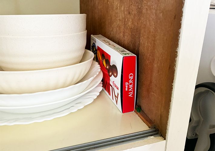 そこで、『アーモンドチョコレート』の紙箱の出番です!この箱の絶妙なサイズ感が、キッチン周りのごちゃつきをスッキリ解消してくれます。