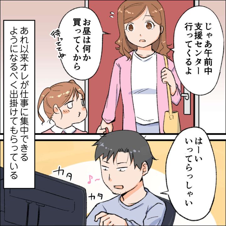 2人には申し訳ないけど、オレが仕事に集中できるよう、在宅ワーク中はできるだけ外出してもらうことにしました。今日は午前中に支援センターへ行く予定みたいで、お昼も買ってきてくれるとのこと。オレは上機嫌で2人を送り出し、さっそく仕事に取りかかります。やっぱり家の中が静かなほうが仕事が捗るなぁ。