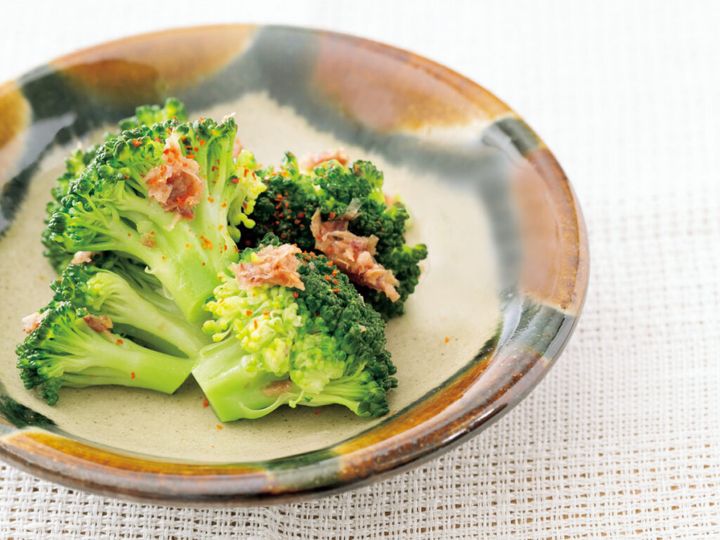 ブロッコリーのピリ辛おかかあえは、削り節のうまみとピリ辛のアクセントで、シンプルながら味わい深い一品。高血圧対策にもぴったりです。