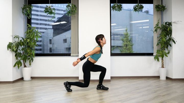2.前膝を90度に曲げ、後ろの膝を床の方に下げてランジの姿勢をつくる