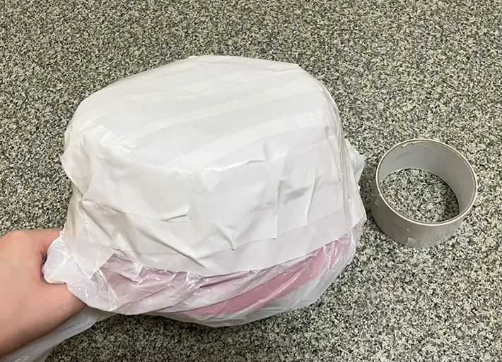 ビニール袋が大きいので、ガムテープが貼れていない部分も多いのですが、この状態で一度片手鍋を外してみます。