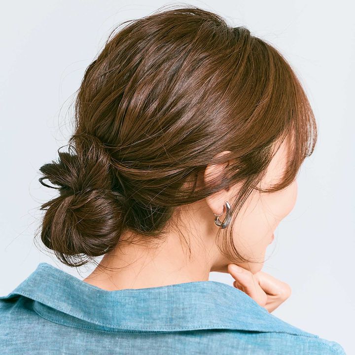髪を巻くことで白髪は目立たなくなりますが、外出先では髪が巻けないので、シニヨンにして隠すのが一番! 結んだ髪の表面は軽く引き出し、立体的にしてカバーします。