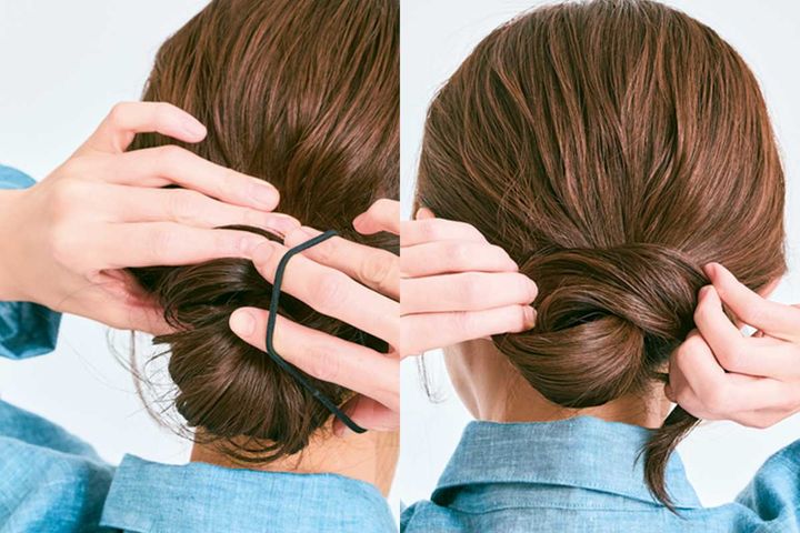 3.結んだ毛束を根元に巻きつけたら、もう1本のゴムをかぶせてシニヨンに。小さめにすると全体の白髪が隠れます。