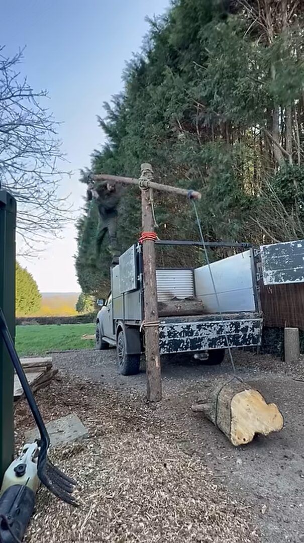 ご紹介するのは、イギリスで撮影された映像です。 重量のある丸太を用いて、「ある装置」の効果を分かりやすく見せてくれていました。