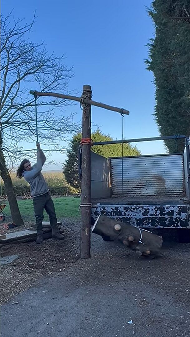 そう、男性は木を組み合わせる事で自重だけで丸太を荷揚げできる装置を製作していたのです!!