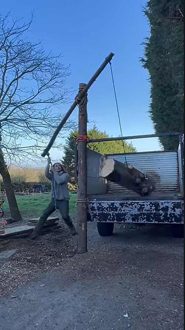 男性が荷台から飛び降りると、この「T」の字状に組み合わされた木を支点として、丸太が持ち上げられました! しかも、着地を工夫する事で丸太を持ち上げるだけでなくトラックの荷台に運ぶことに成功しているではないですか!!