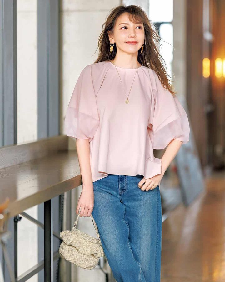 ➀「半袖だとまだ寒い」この時期に重宝!デニムが洒落る「五分袖トップス」