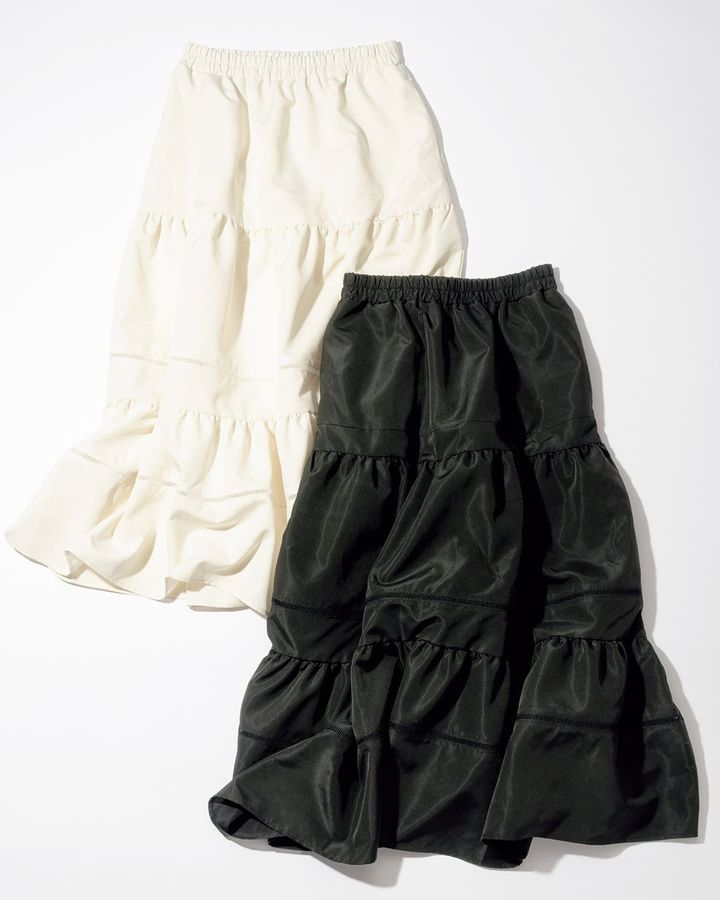合わせるトップスで印象は自在!甘すぎない洗練スカートで好印象。段々に広がるボリュームスカートはこれからの季節はTシャツ合わせに重宝。お腹周りはスッキリ見せるので、着太りはゼロ。ウエストゴムでストレスなく着られます。