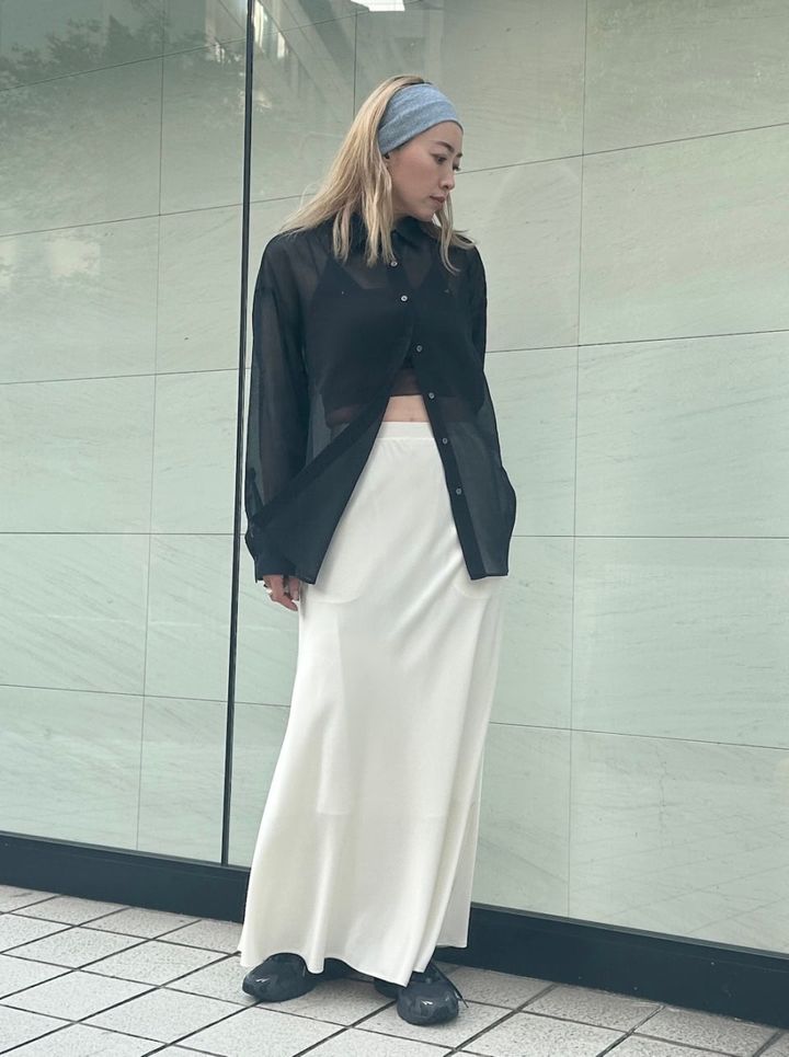 「これから活躍頻度が増しそうなシアーシャツをメインに、ツヤのあるサテンナロースカートで女っぽくコーディネートしました。透け感もあるのでインナーにはベアトップをレイヤードし、あえて裾だけボタンを留めずヘルシーな肌見せをすることでヌケ感のある着こなしに。大人が取り入れやすいモノトーンスタイルでモード感をプラスしたのもポイントです。スニーカーやリブのヘアバンドでスポーティなムードも取り入れ、ほどよくハズしています」