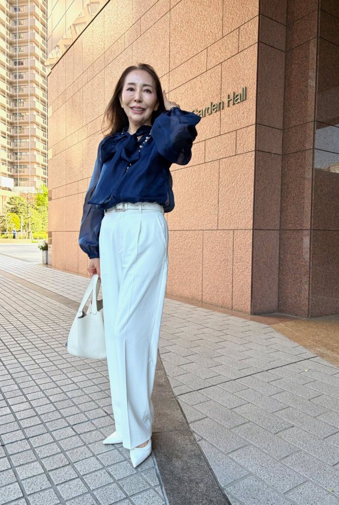 【60代街角スナップ】「ユニクロ」白パンツ×「ZARA」ネイビーシャツで作る洗練コンサバスタイル