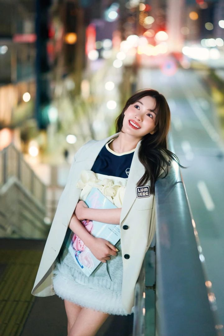 ビスチエ(ビスチエつきニットトップス)は着回し。ベージュジャケット 20,900円/COCO DEAL(ココ ディール)ロゴ Tシャツ 8,600円/EIMS(HANA SHOWROOM)チュールミニスカート 5,940円/LiLiRena