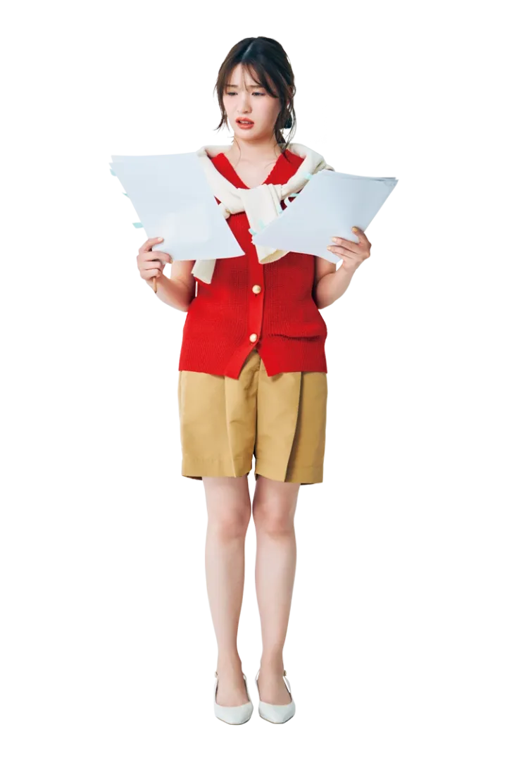 ビスチエつきニットトップスは着回し。ハーフパンツ 3,280円/神戸レタス 手に持ったバッグ 2,990円/神戸 レタス ネックレス 19,800円/vMK8MK(soja showroom)リング 4,950円/Q-pot(805showroom)パンプス 10,890円/EVOL ※床に置いたジャケット 24,750円/La boutique BonBon 花柄スカート 19,800円/DEICY