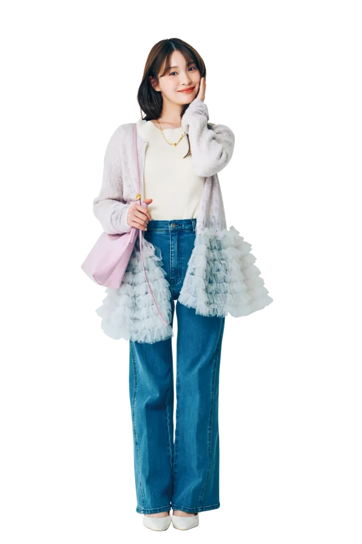 スタイルアップ効果抜群なフレアーデニムパンツをあわせたオトナコーデ。カーディガンのチュールやシューズを白にすることで統一感も◎。